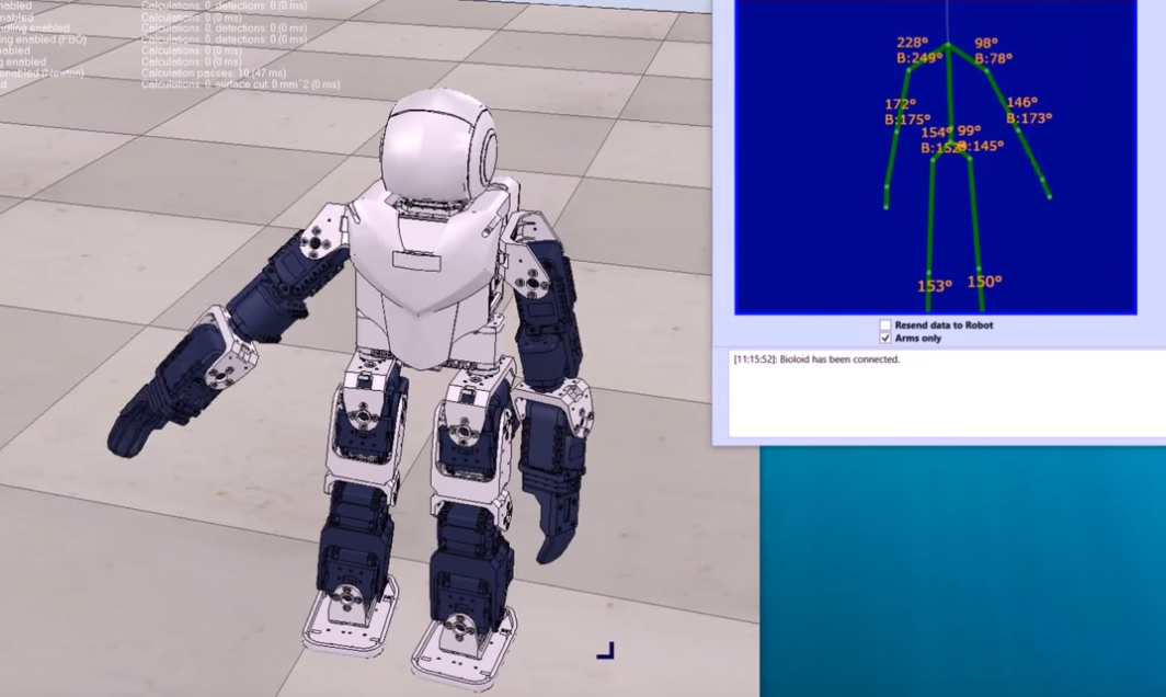 Pro vyhodnocení pohybů těla operátora byl použit snímač Kinect. Řídicí počítač systému sbírá údaje ze sensoru Kinect, upravuje je a bezdrátové přeposílá zrcadlené pohyby do robotu. Robotický systém je tedy rozdělen na dvě části: část operátora a část robota. Pro obě části systému bylo vyvinuto softwarové řešení (včetně uživatelské rozhraní) v programovacím prostředí Visual Studio C#.
