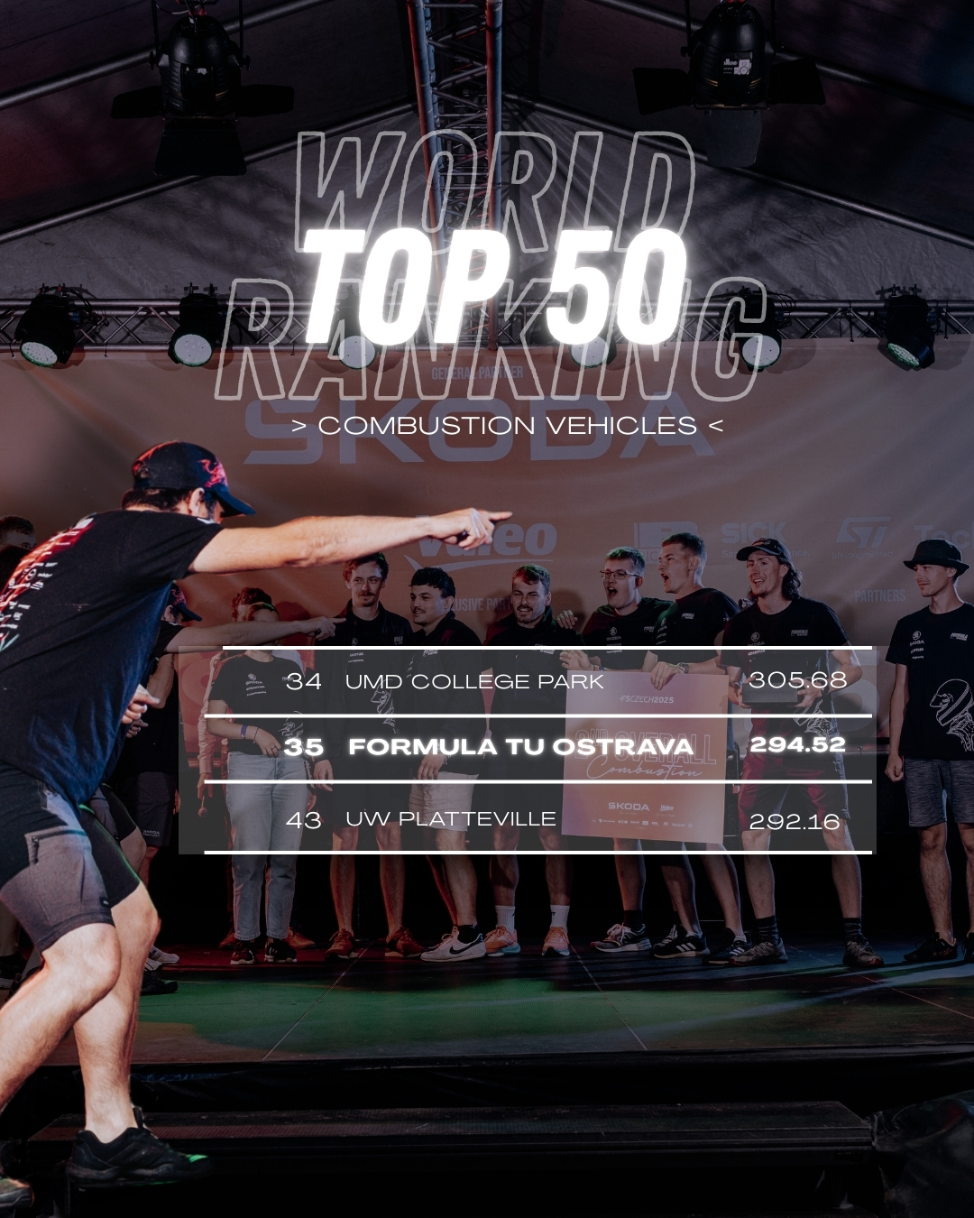 V roce 2025 jsme dosáhli významného milníku ve Formula Student World Ranking. Posunuli jsme se z 93. místa na 35. místo, čímž jsme se zařadili do TOP 50 týmů na světě. Celkem je přitom hodnoceno 450 týmů v kategorii spalovacích a hybridních monopostů. Zároveň jsme se probojovali na 8. místo evropského žebříčku a aktuálně držíme světové prvenství v disciplíně Cost and Manufacturing.
