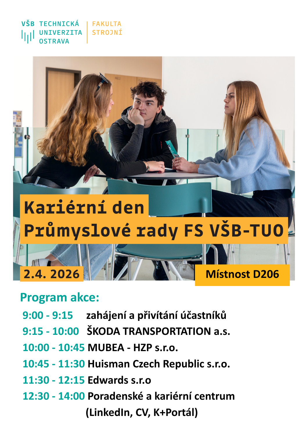 - 12:30–14:00 Poradenské a kariérní centrum (LinkedIn, CV, K+Portál)