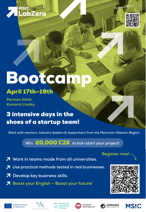 Bootcamp se uskuteční v Penzionu Zátiší v Komorní Lhotce v termínu 17.–19. dubna. Čeká tě spolupráce v týmech složených ze studentů všech univerzit, práce s mentory, lídry z praxe a výzkumníky z Moravskoslezského kraje, využití metod ověřených v reálném byznysu i rozvoj klíčových business dovedností. Navíc můžeš získat 20 000 Kč na rozjezd svého projektu a posunout i svou angličtinu.