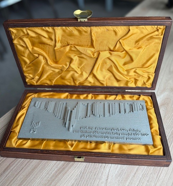 Pamětní plaketa, inspirovaná ikonickým dílem Vladislava Gajdy Prométheus / Rozmach vědy, techniky a civilizace, byla vyrobena v Centru 3D tisku Protolab metodou Selective Laser Melting na stroji Renishaw AM500. Spojuje tak historii univerzity s moderními technologiemi a symbolicky vyjadřuje předávání poznání, zkušeností a hodnot dalším generacím.
